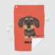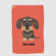 Golf club towel with a cute wirehaired Dachshund and custom name. Makes a fun personalised gift along with matching Teckel golf balls.