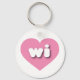 This keychain features a calm, cool, pink heart containing the bold, white, rounded, lower case letters wi, a playful abbreviation for Wisconsin, the badger state.