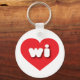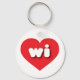 This keychain features a vibrant red heart containing the bold, white, rounded lower case letters wi, a playful abbreviation for Wisconsin, the badger state.