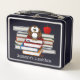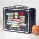Now we know what makes this bird so wise. It's the knowledge contained in these books. This brown and white owl is sitting on a stack of books, with two more stacks on either side. Lunchboxes are available in 7 colours, including stainless. The text can be customised.