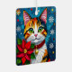 Cute Christmas cat themed ornament with a beautiful calico cat and red poinsettia and snowflakes blue background. On the back you can add your own custom message.
