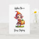 Cute elf with a Christmas gift and blue snowy heart background festive holiday card,