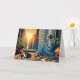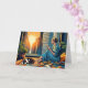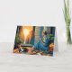 Pretty comic book pop art style woman sitting in a city window holding a coffee cup looking out over the city skyscrapers as the sun rises while her cat naps next to her. Wishing you a peaceful day friendship for family member card.