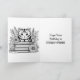 Wishing you a purr-fect birthday. Cute cat pun. Woman reading a book with a cute black cat sitting on her lap. Inside page is a colouring page.