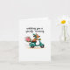 This 'get well' greeting card features a charming cartoon illustration of a brown dog adorned with a green spotted bandanna and a cute pink bow on its head. The adorable pup is cruising on a teal scooter, complete with a bouquet of pretty pink flowers in the back. Below the cheerful image, the message "wishing you a speedy recovery" is written in a handwritten-style black font, adding a personal touch to the design. Against a plain white background, this card exudes a warm and comforting vibe that is sure to bring a smile to anyone's face. 🐶💖