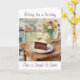 A birthday card with vintage vibes. A rustic wood kitchen table with a plate with birthday cake and vase of flowers in a mid century kitchen.