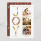 Wishing You Peace, Love and "Joy" Christmas Holiday faux foil gold-toned design featuring a wreath overlaid on the "O" in "Joy" on the left with three photos of your choosing on the right. Simply add the year and your family name to complete the design. The back features a repeat pattern of holiday greenery and berries. Front has a white background. Also available in real gold foil in our shop.