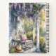 This tranquil watercolor design captures the essence of a slow, sunlit afternoon on a country porch. Cascading wisteria blooms in soft purples drape over a weathered pergola, framing a peaceful scene centred around a cosy rocking chair topped with a quilted cushion. A wide-brim straw hat rests nearby, suggesting recent company, while a glass of lemonade and a teacup invite pause and reflection. Butterflies dance gently through the air, bringing movement to the calm. The hand-painted style gives a dreamlike, nostalgic feel, ideal for evoking memories of summer retreats, farmhouse living, and moments of mindful rest. Display this scene in spaces where peace, charm, and nature are welcome—perfect for a reading nook, sunroom, or entryway gallery wall. AI generated artwork.