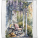 This tranquil watercolor design captures the essence of a slow, sunlit afternoon on a country porch. Cascading wisteria blooms in soft purples drape over a weathered pergola, framing a peaceful scene centred around a cosy rocking chair topped with a quilted cushion. A wide-brim straw hat rests nearby, suggesting recent company, while a glass of lemonade and a teacup invite pause and reflection. Butterflies dance gently through the air, bringing movement to the calm. The hand-painted style gives a dreamlike, nostalgic feel, ideal for evoking memories of summer retreats, farmhouse living, and moments of mindful rest. Display this scene in spaces where peace, charm, and nature are welcome—perfect for a reading nook, sunroom, or entryway gallery wall. AI generated artwork.