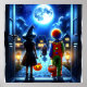 Scary Halloween poster with ai art depicting a little boy and girl in a clown and witch costume walking out the house to encountered a scary monster at the end of their sidewalk.