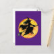 colourful design of a witch riding her magic broom in front of a bright yellow and golden coloured moon.