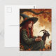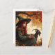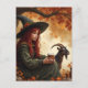 A cute witch under and autumn tree enjoying a coffee with her pet goat