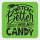 This Halloween-themed design features the playful phrase "Witch Better Have My Candy" arranged in a dynamic, mixed-font layout. The word "Witch" is displayed in bold, blocky letters, while "Better" is written in a cursive, flowing script, adding a sense of urgency and fun to the design. The phrase "Have My" is enclosed within a banner, further emphasising the demand. The word "Candy" stands out at the bottom in large, block letters, with small skull illustrations integrated into the design. Additional Halloween elements, such as a witch's broomstick, a bat, a star, and wrapped candy, are scattered throughout the composition, enhancing the spooky and festive feel.