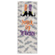 Orange and purple, striped witch stockings, and black, witchy boots, witch shoes, Drink Up Witches Wine Bag, wine tote with a faded bat patterned background.
