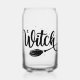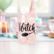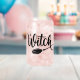 This black-and-white design features the word "Witch" in a bold, flowing script font, with the tail end of the letter "h" transforming into the handle of a broomstick. The text is stylised with a playful, handwritten look, adding a whimsical touch to the overall theme. Surrounding the word are scattered stars, creating a magical, starry-night effect that enhances the witchy theme. The broomstick, positioned diagonally under the text, adds a dynamic element to the design, suggesting movement and adding depth.