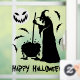 Halloween window clings featuring a witch stirring a boiling cauldron, bats, a scary moon and the text "Happy Halloween".