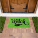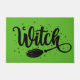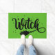 This black-and-white design features the word "Witch" in a bold, flowing script font, with the tail end of the letter "h" transforming into the handle of a broomstick. The text is stylised with a playful, handwritten look, adding a whimsical touch to the overall theme. Surrounding the word are scattered stars, creating a magical, starry-night effect that enhances the witchy theme. The broomstick, positioned diagonally under the text, adds a dynamic element to the design, suggesting movement and adding depth.