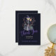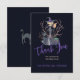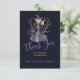 Chic elegant Halloween dark midnight blue and purple watercolor typography bridal shower thank you card template featuring a witch in a grey charcoal dress and hat with a broom and brushwood. Suitable for Halloween wicked witch-themed bridal shower.