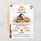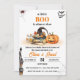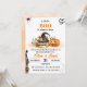 This baby shower invitation features a Halloween theme with a jack-o'-lantern, witch hat, spellbook, and candles at the centre. A spooky spider, bats, and a haunted house add to the eerie charm. Subtle fall details like berries and leaves create a festive yet whimsical atmosphere.