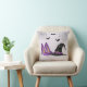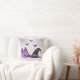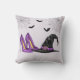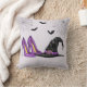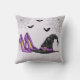 Bring whimsical Halloween style to your space with this festive pillow. The design features a bold witch hat, high heels, spiderwebs in the top corners and three flying bats, all set against a light lilac background.