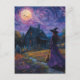 witch in the full moon wearing a purple dress and holding a broom as she walks towards her old wooden house and private graveyard