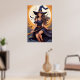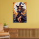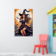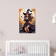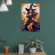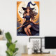 Poster of a cheerful young witch with long flowing hair riding a broomstick in front of a large, glowing full moon. Bats fly around her, adding to the enchanting nighttime scene.