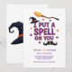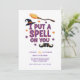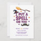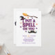 Featuring a witch’s broom, black cat, and glowing pumpkin, this invitation sets the stage for a magical and mysterious Halloween night.