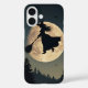 Modern Halloween design featuring a minimalist silhouette of a witch on a broomstick flying across the moon. Clean lines and simple style make it timeless and spooky.