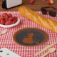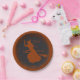 Personalised halloween party paper plate. Vector illustration with grunge silhouette of witch flying on a broom. Text "Halloween party" and "Trick or Treat". Add your name and date.