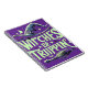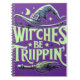A imagem mostra um gráfico com a frase “WITCHES BE TRIPPIN” em letras estilizadas. No topo, há um chapéu de bruxa com fivela inclinado para o lado e luas crescentes e estrelas ao redor dele. Abaixo do texto está uma imagem de uma vassoura.