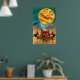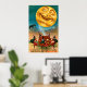 A funny vintage Halloween poster featuring a group of witches dancing around a Jack O'Lantern under the bright smiling moon.