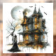 A shadowy figure in a pointed cloak stands before a decaying gothic house, its twin towers glowing with eerie yellow light. Leafless trees claw at the sky while bats swirl beneath a cloud-veiled full moon. Fallen leaves and scattered pumpkins line the path, setting the stage for a haunting encounter. With its moody palette and vintage horror aesthetic, this scene conjures the quiet thrill of Halloween night—mysterious, magical, and steeped in autumn lore.