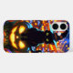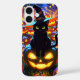 Cute anime-style black cat wearing a wizard hat, floating among glowing pumpkins. Perfect whimsical and magical Halloween artwork.