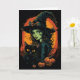 Witchy Halloween Card - a beautiful witch with green skin, wearing her black hat with a girly bow on the front. She is accompanied by her faithful familiar - her black cat who is staring at you with captivating orange eyes. The pumpkins have been carved; grinning, toothless and cold, triangular eyes. Set on a black background with orange coloured frames. Inside is the message - Have a spooky Halloween.