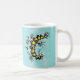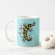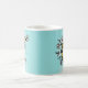 Crescent moon mug with a shaded vector illustration of this yellow celestial body wrapped abstract lily flowers over light blue background with barely visible white clouds. This weird moon digital artwork is drawn in a style resembling tattoos with thick black outlines. It has a mix of gothic and bohemian feel.