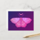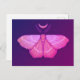 Witchy moth postcard in purple and pink with magical witchy pattern of a yellow moth in the night with half moon and stars above it over dark purple background.