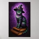 This whimsical poster features a witchy tabby cat sitting on top of two stacked books amongst a vibrant purple backdrop.