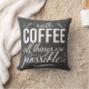 Face the day with a fresh cup of coffee and this cute typography throw pillow. Design features "With Coffee All Things Are Possible" in mixed white typefaces, on a brushed grey chalkboard background.