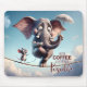 The surface of the mousepad features an enchanting illustration of an elephant and a mouse navigating a tightrope high above the clouds. The elephant, holding a delicate lace parasol in one hand and a tiny cup of coffee in the other, exudes an air of calm and confidence. Its large, expressive eyes and slightly blushed cheeks add a touch of endearing innocence to its demeanour. Beside the elephant on the tightrope, a small, animated mouse offers encouragement. Its tiny paws are raised in excitement, and its wide eyes convey a mix of astonishment and cheerfulness. The mouse's playful nature contrasts beautifully with the elephant's serene composure. The backdrop of this whimsical scene is a sky filled with soft, fluffy clouds, providing a sense of elevation and tranquillity. The light blue hues of the sky complement the gentle colours of the characters, creating a harmonious and visually pleasing composition. Below the illustration, the motivational phrase "With Coffee, Anything is Possible" is elegantly written in a combination of bold and cursive fonts. The word "Coffee" is highlighted in a rich, dark brown, emphasising the beverage's importance in this delightful narrative.