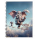 The front cover of the spiral notepad features an enchanting illustration of an elephant and a mouse navigating a tightrope high above the clouds. The elephant, holding a delicate lace parasol in one hand and a tiny cup of coffee in the other, exudes an air of calm and confidence. Its large, expressive eyes and slightly blushed cheeks add a touch of endearing innocence to its demeanour. Beside the elephant on the tightrope, a small, animated mouse offers encouragement. Its tiny paws are raised in excitement, and its wide eyes convey a mix of astonishment and cheerfulness. The mouse's playful nature contrasts beautifully with the elephant's serene composure. The backdrop of this whimsical scene is a sky filled with soft, fluffy clouds, providing a sense of elevation and tranquillity. The light blue hues of the sky complement the gentle colours of the characters, creating a harmonious and visually pleasing composition. Below the illustration, the motivational phrase "With Coffee, Anything is Possible" is elegantly written in a combination of bold and cursive fonts. The word "Coffee" is highlighted in a rich, dark brown, emphasising the beverage's importance in this delightful narrative.
