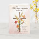 A gentle watercolor design featuring a wooden cross accented with golden wheat and autumn leaves, paired with a soft wash background. The front scripture reads “May the God of hope fill you with joy in believing, so that you may abound in hope.” This timeless message of comfort and faith makes it a thoughtful choice for sending condolences, offering encouragement, and sharing hope with those who are grieving.