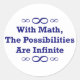 With Math, The Possibilities Are Infinite...This funny design is perfect for any math teacher or student with a mathematics major. Whether you're studying or teaching algebra, trigonometry, geometry, calculus, or simple addition and subtraction, this design is for you. See our shop for more unique and funny math shirts and gifts.