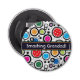 Bottle opener with Colourful pickleballs and black circles on white background. Perfect as a gift for a fashionable pickleball player. Customisable text.