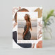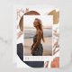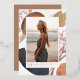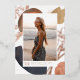 Simple and modern photo graduation announcement features a vertical photo on a background of neutral colour watercolor shapes and earth tone abstract splotches with rose gold foil accents. Personalise with your grad's name, school, and class year beneath. Add a personal message to the back, along with an additional photo.