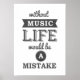 A typography poster featuring fun quote Without Music Life Would be a Mistake in chalkboard colour and white. You can change the background colour to any colour by removing the chalkboard and 'Edit' the background colour.