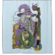 A wizard all in purple holding a staff that has a purple crystal ball. A small green dragon, Celtic knot work, candle and a border of autumn leaves all in a backdrop of light blue