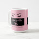 Woke Up Like This eyelashes mug with custom colour background. Popular Woke Up Like This theme used to raise awareness for rheumatic diseases like rheumatoid arthritis / rheumatoid disease. Hashtag stiff, painful, and swollen says how most people with RA / RD do wake up. Closed eyes with long beautiful eyelashes playfully emphasise the theme of waking up while hinting at the invisible nature of these diseases. (Note this design is all black — do not order this design on a black t-shirt or the design will be invisible.) Light and bright colours look great.