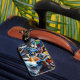 A vibrant colourful ai illustration of a wolf and an owl in a mosaic stained glass effect. A nice luggage tag to for those who love wildlife.