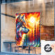 Stunning wolf face with the sun shining brightly in the background in the forest in a colorful design. Perfect for home, office or present. Window Cling.