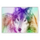 Colourful digital art rendering of wolf face.